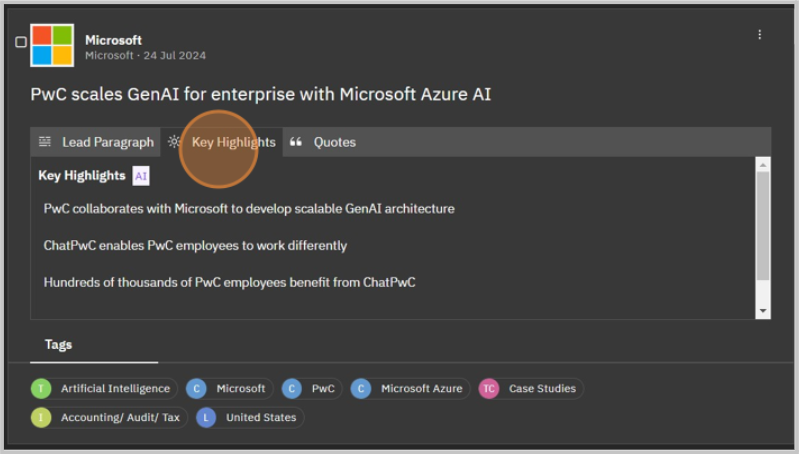 In Contify Newsfeeds module, the Key Highlights and Quotes tab is now visible to all users by default, and no additional permissions are required. This update makes it easier for all platform users to access concise information instantly and easily without barriers.